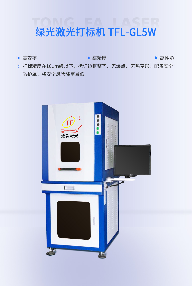 通發激光研發的TFL-GL3W/5W 綠光激光打標機配備安全防護罩,避免設備操作員誤操作引起的人身傷害,將安全風險降至最低,產品遠銷海內外.打標精度在10μm級以下,標記邊框整齊、無爆點、無熱變形,有效提高加工的成品合格率,使用壽命長、配合全封密光路、特別加固的光路底座滿足長期、穩定性的工作需要。
