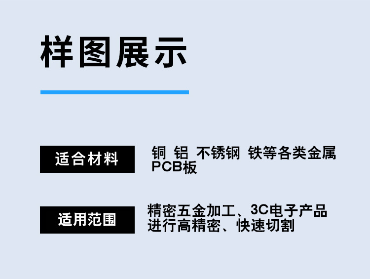 適用范圍廣,可加工銅、鋁、不銹鋼、鐵、pcb板、磁性材料等多鐘材料。幅面大小可選,長(zhǎng)度可根據(jù)用戶加工需求定制。切割速度快,效果光滑平整,切口沒有機(jī)械應(yīng)力,光滑平整無剪切毛刺。